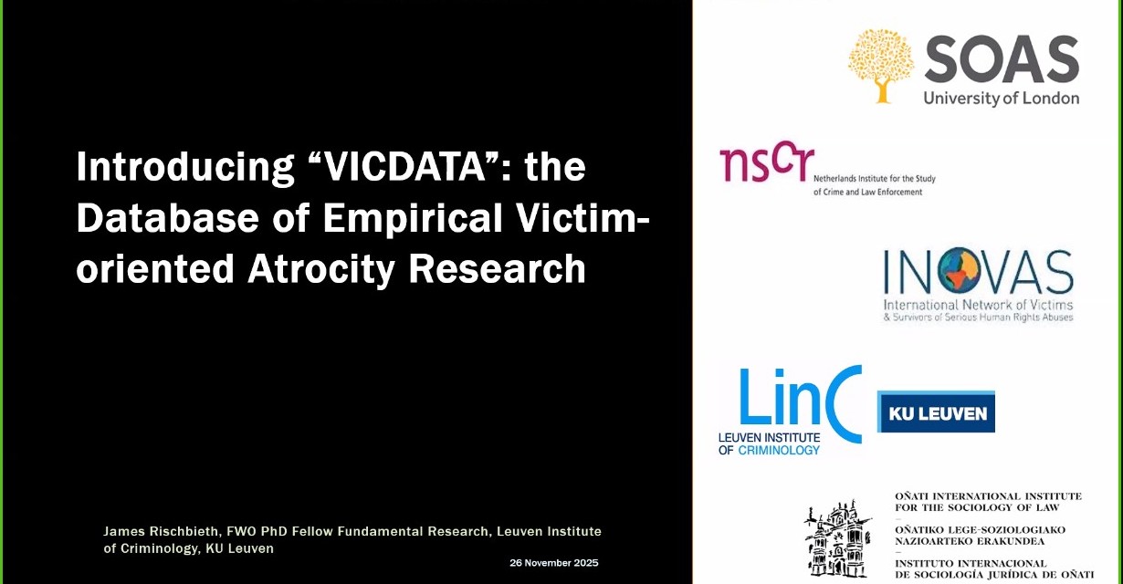 This project aims at the creation and maintenance of an online database of empirical victim-oriented atrocity research: the ‘VICDATA Database’and the facilitation of research projects, training, and teaching; the generation and exchange of information; and exchanges in the academic field. This project is led by the VICDATA Consortium composed by the Leuven Institute of Criminology, Faculty of Law and Criminology of the Katholieke Universiteit Leuven; the Netherlands Institute for the Study of Crime and Law Enforcement; the School of Oriental and African Studies, University of London; the International Network of Victims & Survivors of Serious Human Rights Abuses and the Oñati International Institute for the Sociology of Law.