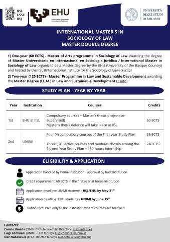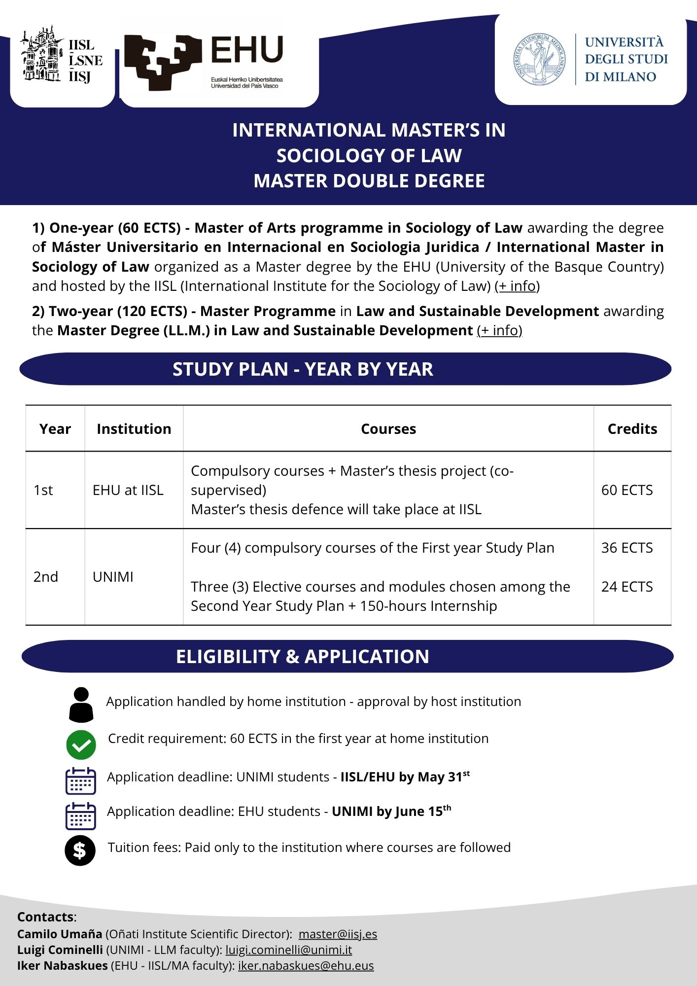 From the academic year 2019/20, by spending a further year at the Master in Sustainable Development of the University of Milan, the students of the Oñati IISL Master's Programme are able to obtain a double degree in Sociology of Law and in Sustainable Development.
